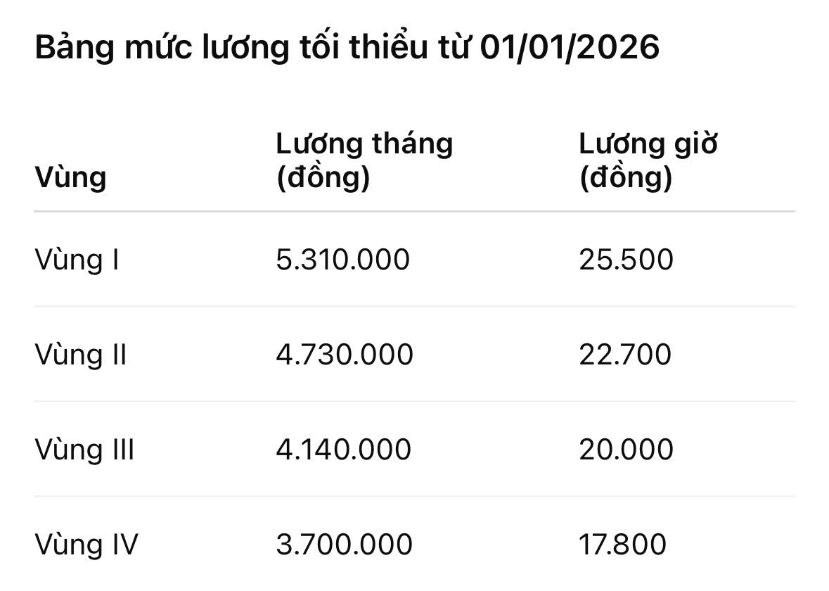 Nghị định có hiệu lực từ ngày 01/01/2026. Quy định mức lương tối thiểu theo vùng, áp dụng toàn quốc: